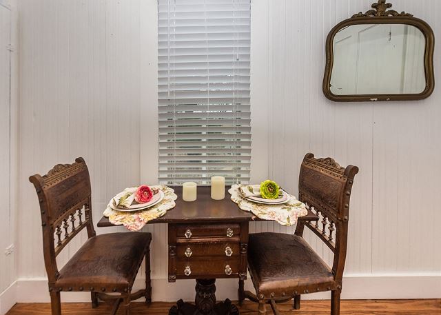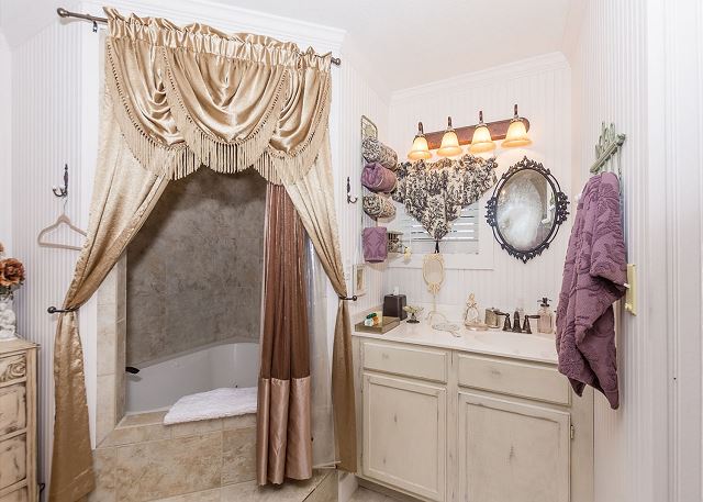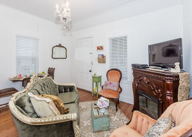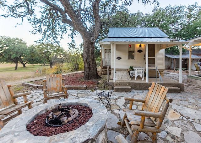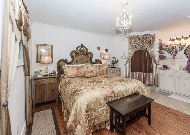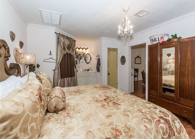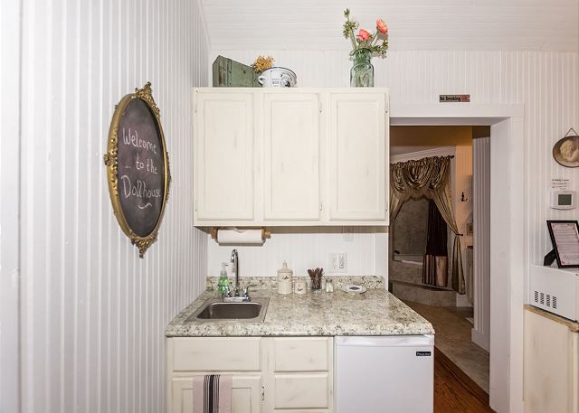 A smaller version of the gorgeous The Wine Cellar –The Farmhouse, The Dollhouse cottage is filled with gorgeous linens, shabby chic furniture, and cozy comforts throughout. A King size bed and double Jacuzzi tub welcome you as you enter the bedroom area and they are waiting to help you unwind and relax. Enjoy the quaint living room with a flat screen TV and electric fireplace or take advantage of the front porch seating and enjoy a warm fire around the electric fire pit just outside your cottage. Give us a call today to book your stay at The Wine Cellar-The Dollhouse.